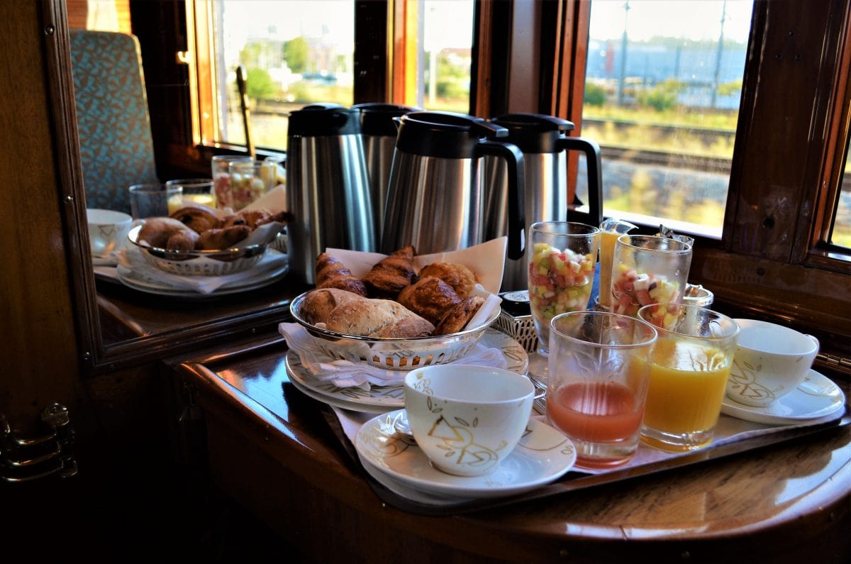 Breakfast includes pastries, fruit parfait, juice, tea and coffee. Guests may either dine in the restaurant car or have their breakfast brought to them as 'breakfast in bed'.